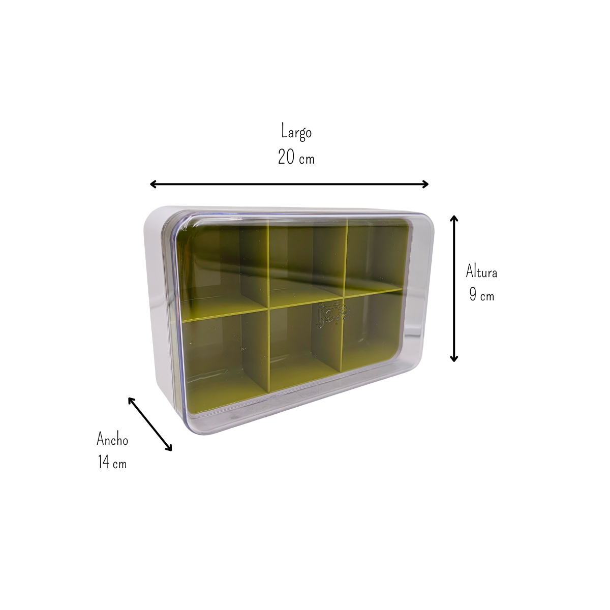 - Diseño: Rectangular con divisiones y tapa ajustada